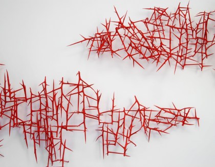 I am very exited about this new piece that I recently installed. It is a commission for a private collector. It is made of honey locust thorns and is approximately 9′ x 30″. I think of this as a kind of landscape informed by my artist residency at Youkobo in Tokyo.